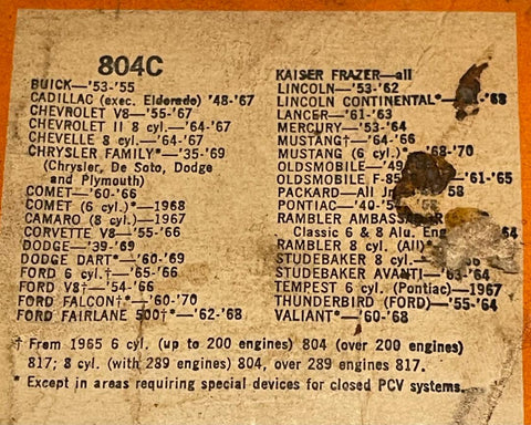 1953-55 BUICK - 1948-67, CADILLAC 1955-67 CHEVROLET V8 CHEVY ii 8 CYLINDER 1964-67 CHEVELLE, 1935-69 CHRYSLER, 1960-66 COMET, 1967 CAMARO V8, 1955-66 CORVETTE V8, 1939-69 DODGE, 1954-1970 FORD, KAISER FRAZER ALL, 1953-62 LINCOLN, 1961-63 LANCER, 1953-64 MERCURY, 1964-70 MUSTANG, 1945-69 OLDSMOBILE, PACKARD PONTIAC RAMBLER, STUDEBAKER TEMPTEST VALIANT THUNDERBIRD