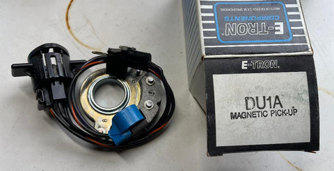 One NOS E-TRON DU1A magnetic pick-up, designed for electronic ignition systems. Ideal for vintage distributor conversions or replacement of worn sensors. Compatible with select GM, Ford, and Chrysler setups using magnetic triggering. Cross-reference compatible with Accel 35361, Mallory 605, and others.