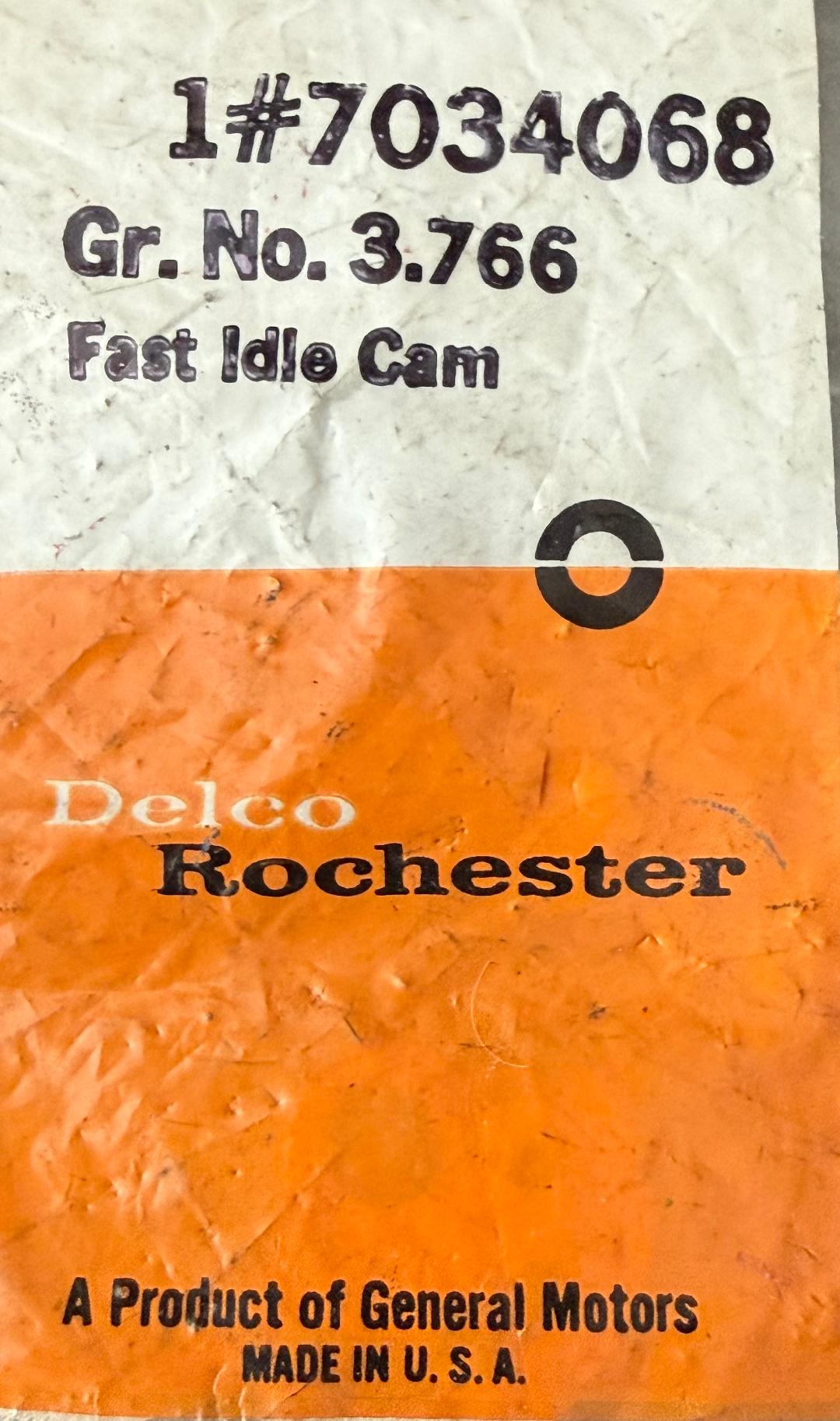 Description: Genuine GM 7034068 Fast Idle Cam, Group 3.766, New Old Stock in original Delco Rochester packaging. Correct for 1968 Chevrolet 4‑cylinder and 6‑cylinder applications using Rochester 1‑barrel carburetors. This cam indexes the choke linkage to set proper fast‑idle speed during cold starts — a critical component for concours‑correct carburetor restoration.