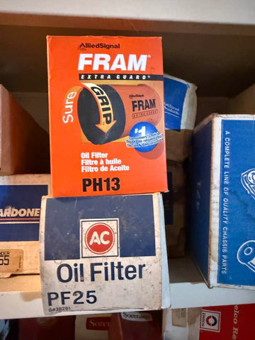 Vintage Fram PH13 spin-on oil filter in original box. Designed for GM V8 engines from the 1960s–70s, including Chevrolet 283, 327, and 350 applications. Also fits select Buick, Pontiac, GMC, and marine engines. Crosses to AC Delco PF1218, Wix 51060, and Motorcraft FL12.