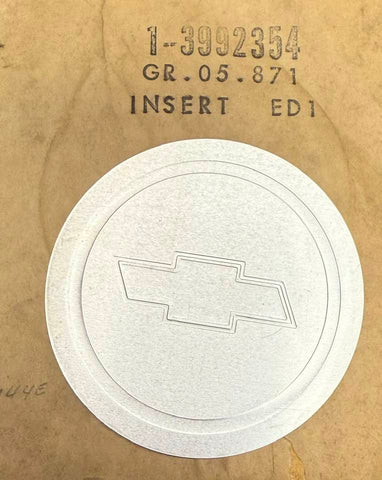 NOS 1971-72 CHEVROLET PASSENGER CAR - GM #3992354 - HUB CAP / WHEEL COVER INSERT - BOW TIE DESIGN - 3 8/16 DIAMETER - USE W/ GM #6264291 - #3968761 COVER ASSY
