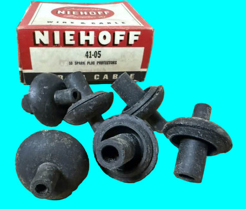An NOS factory pack of 10 rubber spark plug protectors made by Niehoff Wire & Cable. These classic ignition cable accessories shield spark plug terminals from oil, dirt, and moisture, preserving the integrity of every spark and keeping vintage engines firing clean.