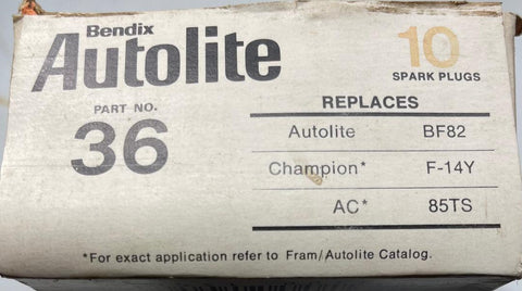 For sale: A full box of 10 NOS Autolite 36 spark plugs, resistor-style and proudly made in the USA. These plugs replace Autolite BF82, Champion F-14Y, and AC 85TS — ideal for vintage Ford, Mercury, and Lincoln engines from the 1950s–60s. Perfect for restorers, collectors, or anyone seeking period-correct ignition components.